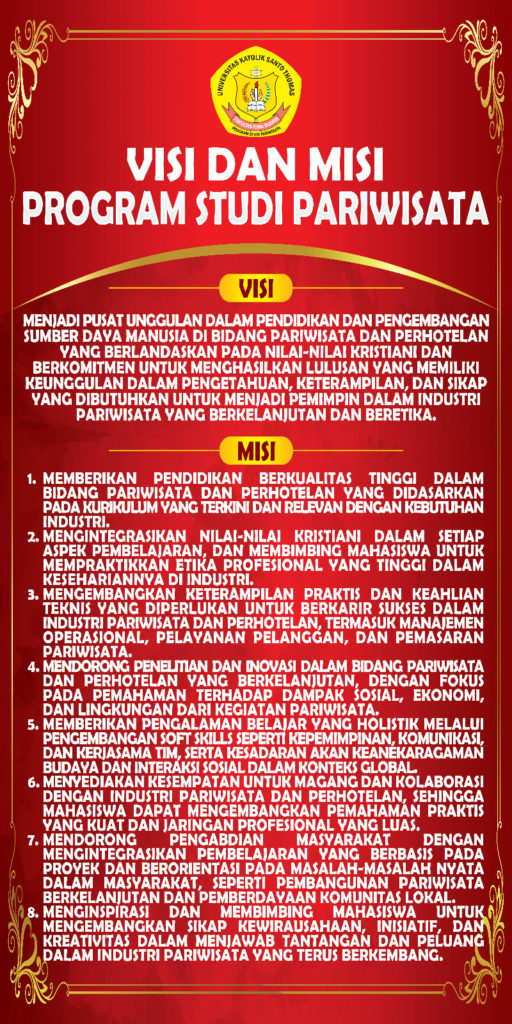 Kami percaya bahwa pendidikan adalah tentang pengembangan holistik. Oleh karena itu, kami tidak hanya fokus pada pengembangan akademik tetapi juga mendukung kegiatan ekstrakurikuler yang memperkaya pengalaman mahasiswa. Dengan visi menjadi program studi pariwisata yang dalam pengetahuan, keterampilan, dan sikap yang dibutuhkan untuk menjadi pemimpin dalam industri pariwisata yang berkelanjutan dan beretika, serta misi untuk menghasilkan lulusan yang profesional, berintegritas, dan inovatif, kami mengundang Anda untuk bergabung dengan kami. Bersama-sama, kita dapat menciptakan masa depan yang gemilang di dunia pariwisata. Program Studi Pariwisata Fakultas Ilmu Budaya Universitas Katolik Santo Thomas adalah tempat di mana mimpi Anda untuk menjelajahi dunia dapat dimulai. Mari bergabung dan jadilah bagian dari komunitas kami yang dinamis dan inspiratif!.