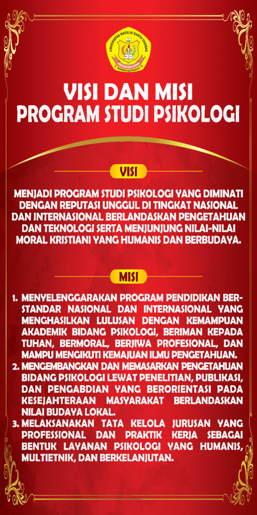 “Visi Program Studi Psikologi di Universitas Katolik Santo Thomas adalah menjadi jurusan psikologi yang diminati dengan reputasi unggul di tingkat Nasional dan Internasional berlandaskan pengetahuan dan teknologi serta menjunjung nilai-nilai moral Kristiani yang humanis dan berbudaya. Program Studi Psikologi berkomitmen untuk menghasilkan lulusan yang memiliki keunggulan dalam pengetahuan, keterampilan, dan sikap yang dibutuhkan dalam dunia pendidikan, kesehatan, sosial dan industri organisasi. Melalui pendekatan holistik yang mengintegrasikan aspek akademis, spiritual, dan praktis, UKST bertujuan untuk memberdayakan mahasiswa untuk menjadi agen perubahan positif dalam memajukan serta melayani masyarakat dengan dedikasi, integritas, dan keberdampingan.”